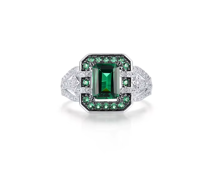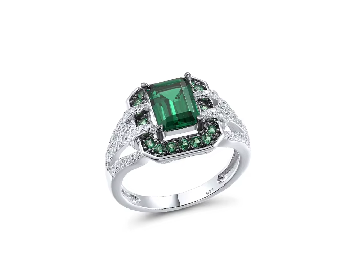 Sublime bague en argent 925 orné d’une spinelle verte éclatante entourée de zirconiums blancs. Son design géométrique et élégant évoque les lignes précieuses des grandes maisons joaillières.