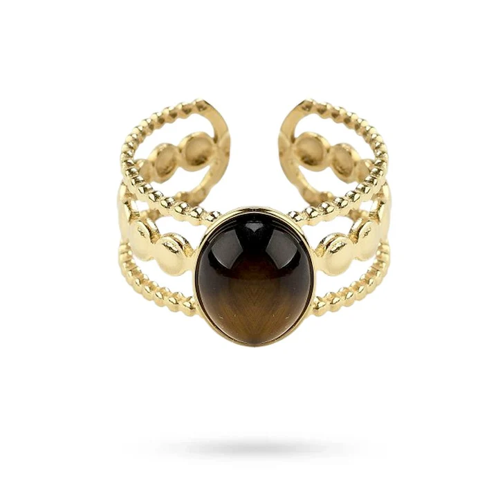 Cette bague femme en acier inoxydable doré associe design moderne et énergie naturelle. Son motif à 3 rangs finement travaillés lui donne un style original et élégant, tandis que la pierre naturelle œil de tigre attire le regard par ses reflets uniques et chatoyants.