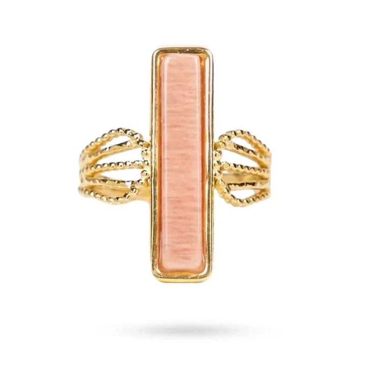 Cette bague en acier inoxydable doré révèle toute la beauté de la pierre du soleil, reconnaissable à ses nuances rosées et à ses délicats éclats scintillants. Sa forme rectangulaire élancée apporte une touche contemporaine, tandis que la monture finement travaillée souligne son caractère raffiné.