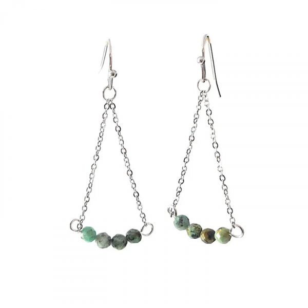Légères, élégantes, résolument bohèmes. Ces boucles d’oreilles en acier inoxydable se parent de fines chaînes argentées et de perles naturelles en turquoise d’Afrique aux nuances vertes et bleutées, pour un look frais, poétique et profondément ancré.