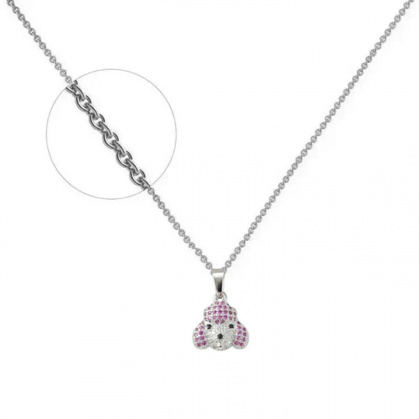 Ce collier Petit Caniche Rose en rhodium incarne la douceur et l’originalité. Son pendentif en forme de petit caniche est entièrement orné de zirconiums roses et blancs scintillants, apportant éclat et fantaisie à votre style.