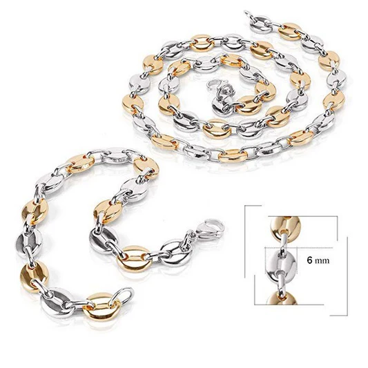 Cette parure pour homme mêle puissance et raffinement dans un design iconique : les maillons grains de café. Avec une finition bicolore doré/argenté, chaque pièce attire la lumière et souligne la personnalité de celui qui la porte.